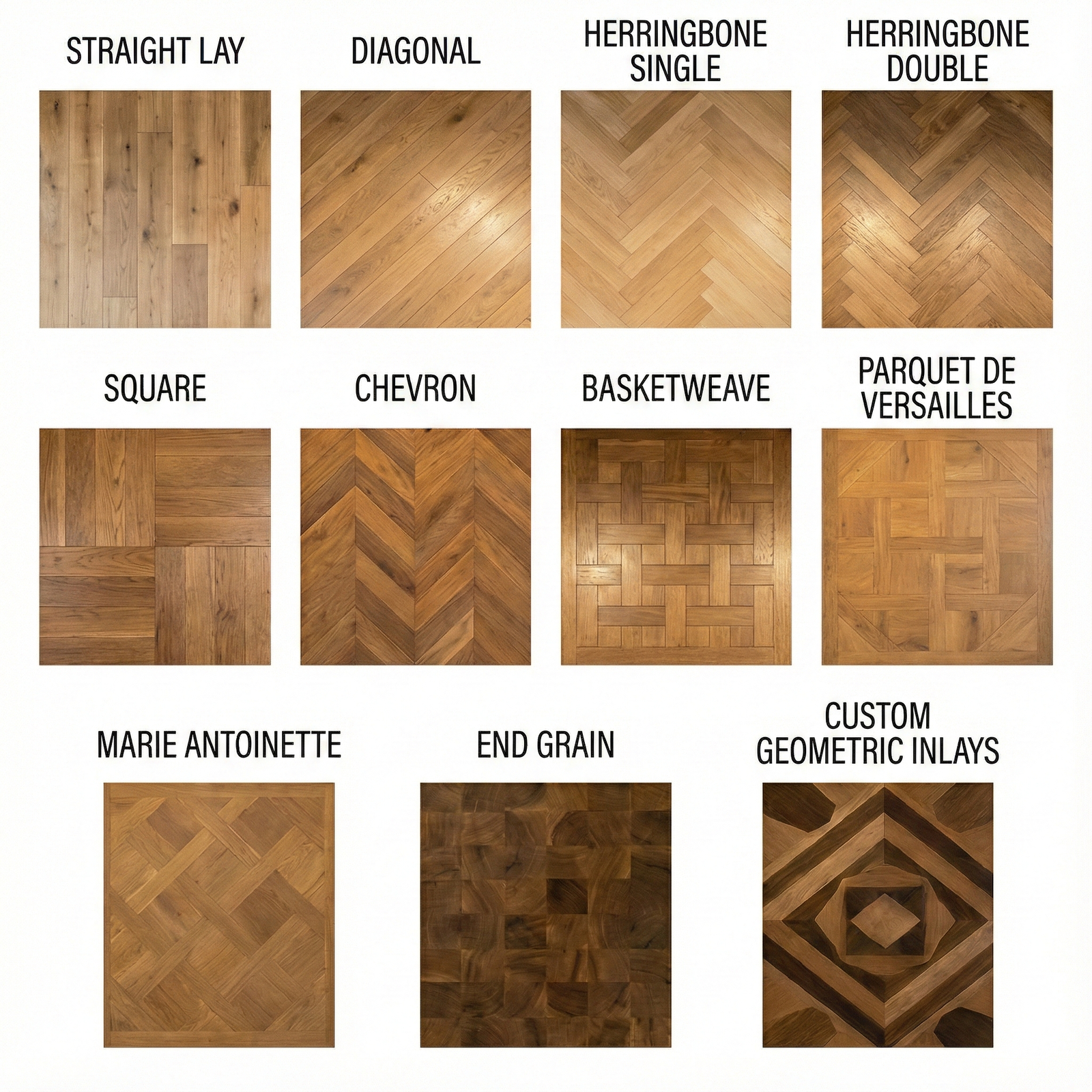 Square, Basketweave, Parquet de Versailles, Marie Antoinette – Detailed parquet work for formal rooms and statement spaces.