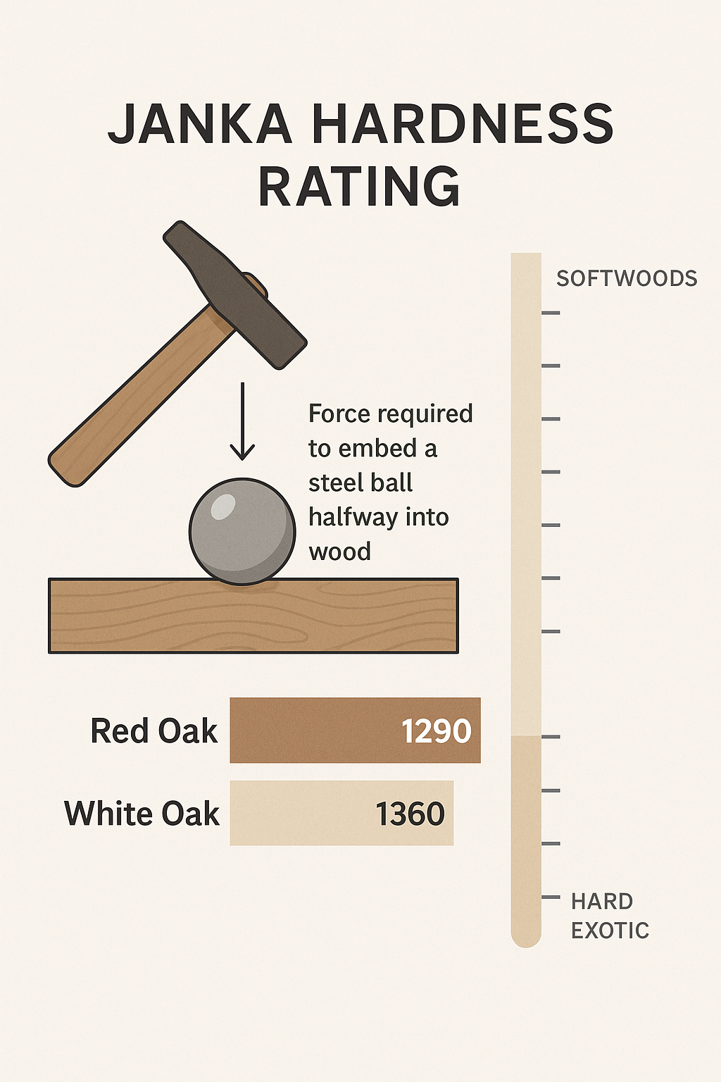 The Janka hardness rating measures how tough a wood is by testing how much force it takes to push a small steel ball halfway into the board, like in this picture with the hammer, ball, and plank. The higher the number, the harder and more dent-resistant the wood. On the scale to the right, softer woods sit toward the top and very hard, often exotic species sit toward the bottom. Common flooring woods like Red Oak (1290) and White Oak (1360) fall in the middle, which means they are strong enough to handle everyday life without being so hard that they are difficult to work with or repair.